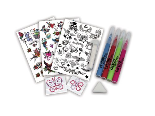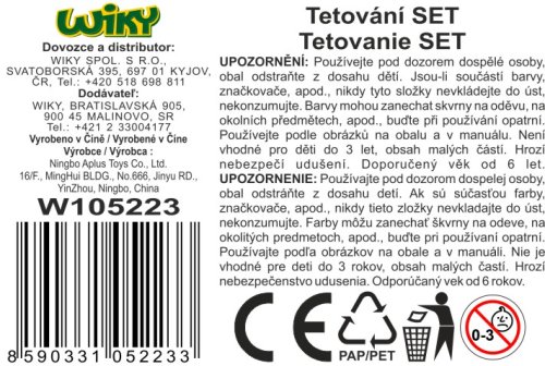 Tetovanie s fixkami set. Balenie obsahuje 4 tetovacie fixky, tetovačky, kamienky, hubku, štetec a flitre.