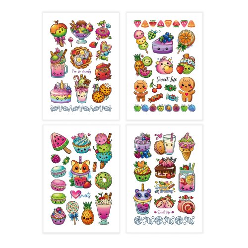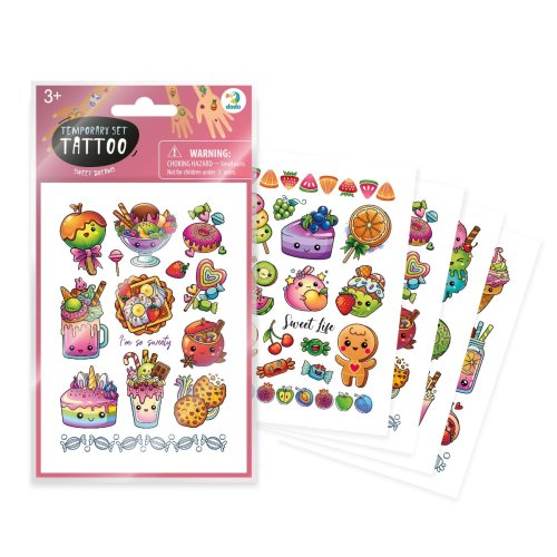 Ozdobte si svoje telo krásnym farebným tetovaním. Vystrihnite vybraný obrázok. Pritlačte ho na čistú a suchú pokožku Navlhčite ho vodou a po 30 sekundách odstráňte papierik. Tetovanie je možné odstrániť mydlom alebo olejčekom. Vybrať si môžete z niekoľkých motívov obľúbených cukroviniek. Obsahuje 4 listy tetovačiek. Rozmery balenia 11,5 x 20 x 0,01 cm. Vhodné pre deti od 3 rokov.