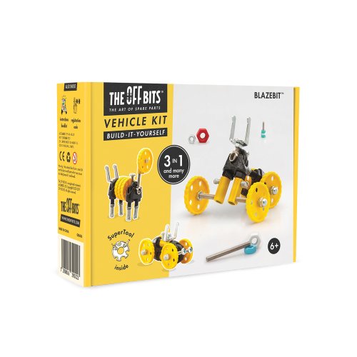 Zahrejte motor, je čas ísť! BlazeBit je perfektné vozidlo s pohonom 4 kolesá pre vášho robota Offbits. Vďaka sortimentu koliesok a šikovných konektorov vybavíte svojho robota na dobrodružstvo vo veľkom štýle. Popustite uzdu svojej fantázii. Táto sada umožňuje vytvorenie troch modelov s ďalšími nekonečnými možnosťami pre vaše vlastné kreatívne nápady . Ide o hračku, ktorá pomáha mladým ľuďom rásť v oblastiach vedy, technológie, inžinierstva, umenia a matematiky. Hračky OffBits taktiež podporujú rozvoj jemnej motoriky, priestorovej predstavivosti, riešenie problémov a nápadité hry. Čo môžete postaviť: BlazeBit, MotorBit, AnimalBit plus nekonečné množstvo jedinečných výtvorov, ktoré môžete postaviť pomocou svojej fantázie. Máte okolo seba kartón, skrutky alebo iné zábavné materiály? Vylepšujte s predmetmi každodennej potreby a vytvorte tiež svoje vlastné jedinečné vynálezy. Hlavné vlastnosti: obsahuje náradie pre zostavenie stavebnicekompatibilnosť s každodennými predmetmirozvoj kreativity, jemnej motoriky i logického mysleniahodné od šiestich rokov3 v 1 Ilustrační foto balení: