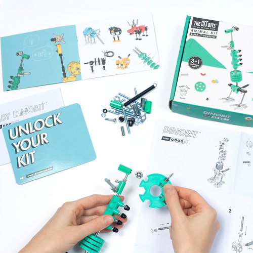 Od hlavy po chvost! DinoBit je milovník histórie. Vďaka sortimentu farebných matíc, skrutiek a tvarovaných kúskov je tento dinosaurus neľútostne lojálny. Popustite uzdu svojej fantázii. Táto sada umožňuje vytvorenie troch modelov s ďalšími nekonečnými možnosťami pre vaše vlastné kreatívne nápady . Ide o hračku, ktorá pomáha mladým ľuďom rásť v oblastiach vedy, technológie, inžinierstva, umenia a matematiky. Hračky OffBits taktiež podporujú rozvoj jemnej motoriky, priestorovej predstavivosti, riešenie problémov a nápadité hry. Čo môžete postaviť: DinosauraBit, dinosaurie mláďa Bit, autoBit 4x4 plus nekonečné množstvo jedinečných výtvorov, ktoré môžete postaviť pomocou svojej fantázie. Máte okolo seba kartón, skrutky alebo iné zábavné materiály? Vylepšujte s predmetmi každodennej potreby a vytvorte tiež svoje vlastné jedinečné vynálezy. Hlavné vlastnosti: obsahuje náradie pre zostavenie stavebnicekompatibilnosť s každodennými predmetmirozvoj kreativity, jemnej motoriky i logického mysleniahodné od šiestich rokov3 v 1 Ilustrační foto balení:
