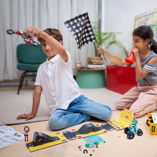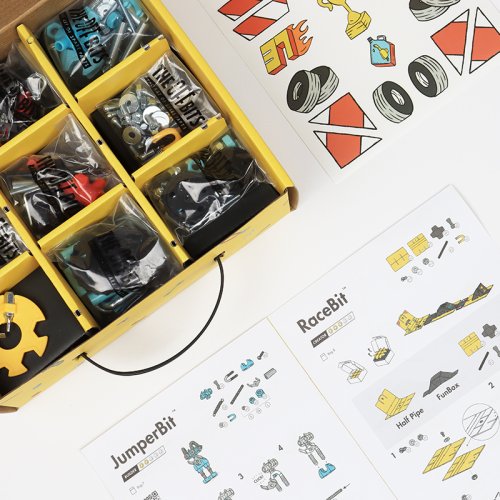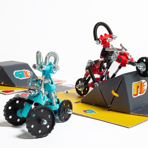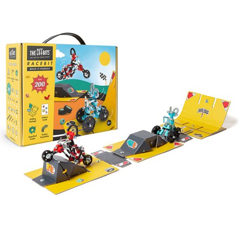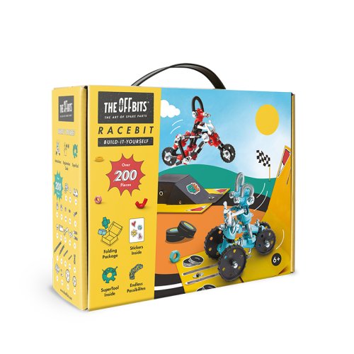 Je čas zaradiť rýchlosť a odštartovať závod. Premeňte kartónovú škatuľu OffBits na závodnú dráhu s rampou a zostavte závodné tímy z matíc a skrutiek. Zostav CharlieBit a jeho červenú motorku CrossBit a potom JumperBit s jeho parádnym modrým ScooterBitom. Nechajte ich medzi sebou pretekať a vyskúšajte, ako vysoko dokážu preskočiť rampu alebo kto urobí najhustejšie triky. Sada obsahuje viac ako 200 farebných matíc, skrutiek, tvarovaných kúskov, samolepiek a naše viacúčelové balenie s nulovým odpadom, ktoré sa premení na súčasť herného zážitku a stane sa závodnou dráhou. Popustite uzdu svojej fantázii. Táto sada umožňuje vytvorenie štyroch modelov s ďalšími nekonečnými možnosťami pre vaše vlastné kreatívne nápady . Ide o hračku, ktorá pomáha mladým ľuďom rásť v oblastiach vedy, technológie, inžinierstva, umenia a matematiky. Hračky OffBits taktiež podporujú rozvoj jemnej motoriky, priestorovej predstavivosti, riešenie problémov a nápadité hry. Čo môžete postaviť: CharlieBit a jeho červenú motorku CrossBit, JumperBit s jeho parádnym modrým ScooterBitom plus nekonečné množstvo jedinečných výtvorov, ktoré môžete postaviť pomocou svojej fantázie. Máte okolo seba kartón, skrutky alebo iné zábavné materiály? Vylepšujte s predmetmi každodennej potreby a vytvorte aj svoje vlastné jedinečné vynálezy. Hlavné vlastnosti: obsahuje náradie pre zostavenie stavebnicekompatibilnosť s každodennými predmetmirozvoj kreativity, jemnej motoriky i logického mysleniahodné od šiestich rokovviac ako 200 dielovobal je súčasťou herného zážitku