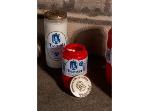 Kompozitná sviečka Theresia v červenej farbe, ideálna na výzdobu hrobov. Horí až 2,5 dňa.