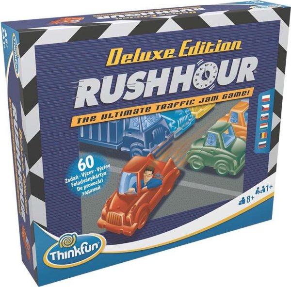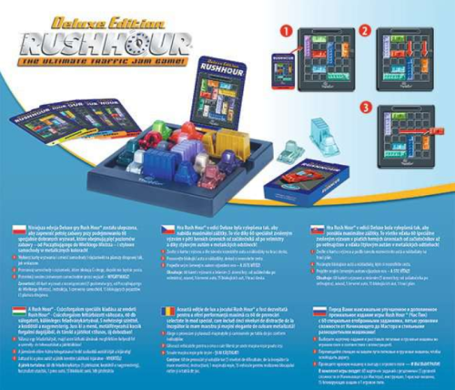 Hra Rush Hour v edícii Deluxe bola vylepšená tak, aby ponúkla maximálne zážitky z hry. To všetko vďaka 60 špeciálne zvoleným výzvam v piatich herných úrovniach od začiatočníkov až po veľmajstry a vďaka štýlovým autám v metalických odtieňoch! Posúvajte blokujúce autá a nákladiaky v pruhoch hore a dole, vpravo a vľavo, kým neuvoľníte cestu k úniku červenému autu. Vozidlami je možné pohybovať dopredu a dozadu, ale nie do strán. Obsahuje: 60 kariet s výzvami a riešením (5 úrovní hry; od začiatočníka po veľmajstra), návod, 1 červené auto, 15 blokujúcich áut, 1 hracia doska.
