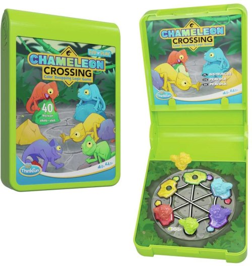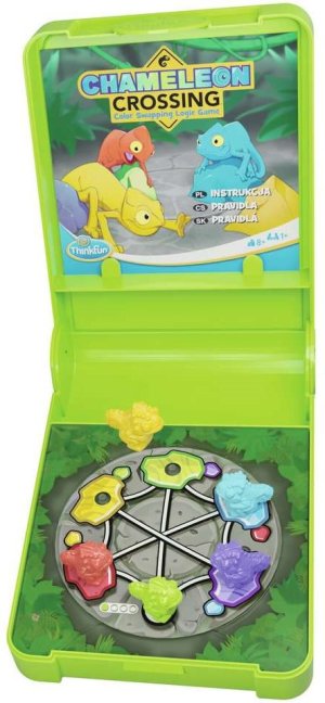 Pomôžte piatim strateným chameleónom nájsť cestu späť na správny domovský kameň! Zábavná logická hra od ThinkFun. Obsahuje: 5 žetónov s chameleónom, 20 obojstranných kariet s úlohami, pokynmi a riešeniami, herný kufrík so vstavanou hracou plochou