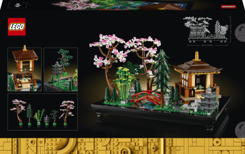 Záhrada plná úžasných funkcií Tento zostaviteľný model je inšpirovaný tradičnou japonskou záhradou a obsahuje klenutý most, potôčik, kapra koi, lotosové kvety, stromy, kamene, kamenné lampy a pavilón s detailnou miestnosťou pre čajové ceremónie.