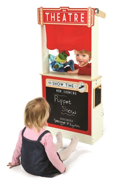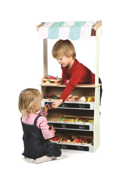 Multifunkčný hrací stolček so strieškou, závesom, policami a tabuľkami na kriedy. Súčasťou je aj malá popisovacia tabuľka. Debničky s potravinami súčasti nie sú, možno ich dokúpiť. Z jednej strany je možné stolček využiť ako obchodík s policami na uloženie potravín - ceny je možné pohodlne napísať kriedou k naukladanému tovaru vďaka praktickým plochám na popis. Z druhej strany je možné stolček využiť ako divadlo. Závesy sa upravia podľa potreby a tabuľka umožní zapísať program alebo namaľovať plagát. V predstavivosti sa medze nekladú. Vyrobené z kvalitného dreva so stabilnou konštrukciou. Hlavné vlastnosti: multifunkčnosť (hra 2v1)stabilná konštrukcia