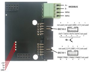 Integrovaná podpora pre priemyselnú zbernicu RS-485 s protokolom Modbus RTU umožňuje pripojenie k širokej škále priemyselných zariadení a senzorov. Pripojenie je realizované cez skrutkovaciu svorkovnicu s vývodmi A+ a B–.