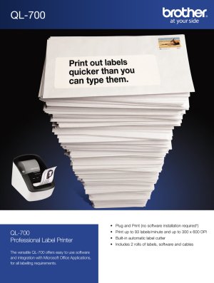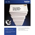 Brother QL-700 je termálna tlačiareň s automatickým odstrihom na papierové samolepiace štítky alebo filmové rolky. Brother QL-700 umožňuje tlač vo vyššom rozlíšení (300 x 600 dpi), rýchlosťou 150 mm/s, na max. šírku štítku 62mm a preto je vhodná na tlač kvalitných log, čiarových kódov a textov. Je vybavená USB 2.0 portom.