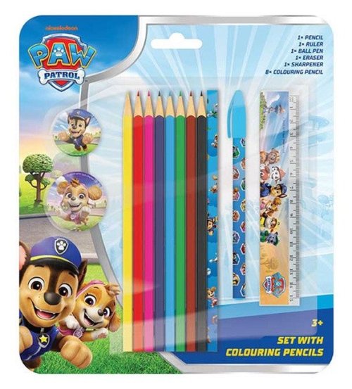 Set obsahuje ceruzku, prepisovačku, strúhadlo, gumu, pravítko a 8 farebných pasteliek.