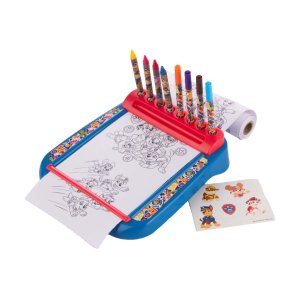 Praktický stojan s rolkou plnou omaľovánok Tlapkovej Patroly. Obsahuje 4 fixky a 4 voskovky.