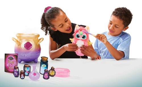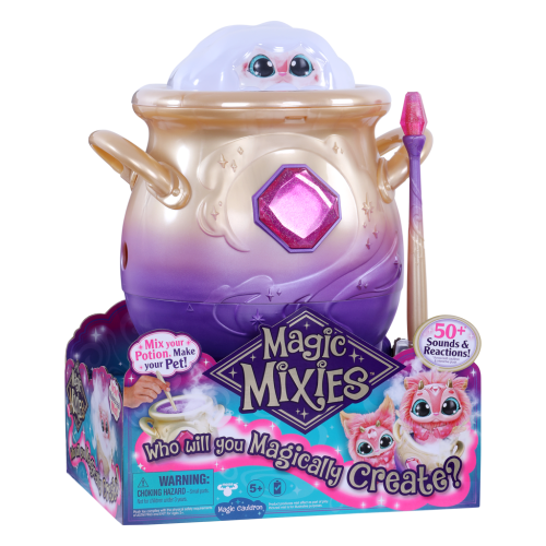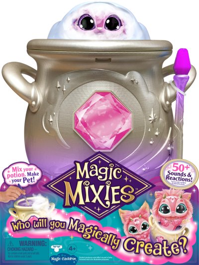 Kúzlený zlatý kotlík s návodom, ktorý vás prevedie krok za krokom celým procesom magického rituálu, pri ktorom si vykúzlite svoju vlastnú kúzlenú bytosť . Po naliatí vody sa kotlík aktivuje a spustia sa zvuky bublania a hudby. Vezmite do ruky kúzlenú paličku, trikrát zaklopte na okraj kotlíka a čarovanie môže začať . Návod vás prevedie jednotlivými krokmi, kedy je potrebné do kotlíka pridávať jednotlivé prísady podľa návodu. K tomu vám tiež napomôžu zvuky, ktoré kotlík vydáva. Vždy, keď bude potrebné zaklopať kúzlenou paličkou o okraj kotlíka a tým prejsť k ďalšiemu kroku, spustí sa zvuk, ktorý vám túto akciu napovie. Prísady do kotlíka sú súčasťou balenia (ampulka na vodu, kúzelný prášok, trblietavá hviezda, vtáčie pierko, magický kryštál, okvetný lístok a papierik, na ktorý napíšete meno pre kúzelnú bytosť, ktorú hodláte vyčarovať a vhodíte ho do kotla). Teraz sa odohrá naozajstné kúzlo. Z kotlíka vystúpi skutočná hmla a odhalíte prekvapenie (funkciu hmly je možné vypnúť). Keď sa hmla rozplynie, namiesto kúzelného lektvaru v kotlíku objavíte nádhernú kúzelnú bytosť Mixie. Mixie je interaktívna hračka, ktorá reaguje na dotyk ako rukou, tak kúzelnou paličkou. Mixia má na čele kúzlený kryštál, ktorý signalizuje náladu. Čím šťastnejšie bude, tým väčšie množstvo zvukov vydáva. Náladu je možné rozoznať podľa farby kryštálu . Mixie reaguje na dotyk kúzelnej paličky - dotykom (1 alebo 2) budete počuť rôzne zvuky (50+ zvukov a reakcií) Celú akciu je možné opakovať po dodržaní krokov podľa návodu. To znamená, že môžete kúzliť