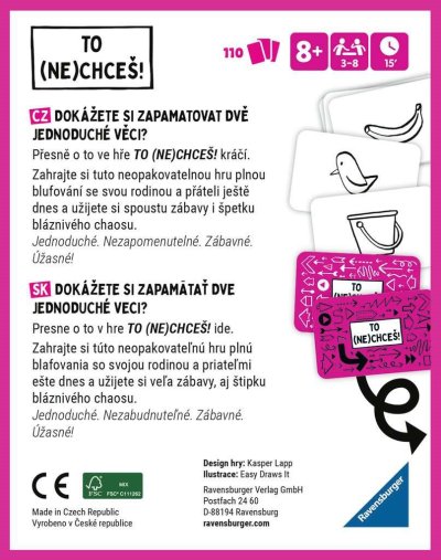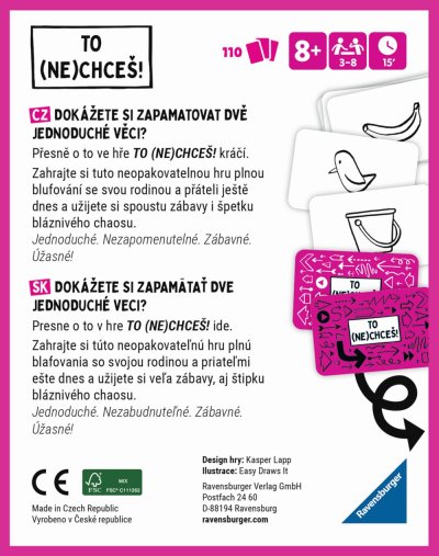 Dokážete si zapamätať dve jednoduché veci? Presne o to v hre TO (NE)CHCEŠ! Kráča. Zahrajte si túto neopakovateľnú hru plnú blufovania so svojou rodinou a priateľmi ešte dnes a užijete si veľa zábavy aj štipku bláznivého chaosu. Jednoduché. Nezabudnuteľné. Zábavné. Úžasné!