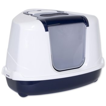 Rohová toaleta pre mačky s plastovým krytom, dvierkami, filtrom a lopatkou.