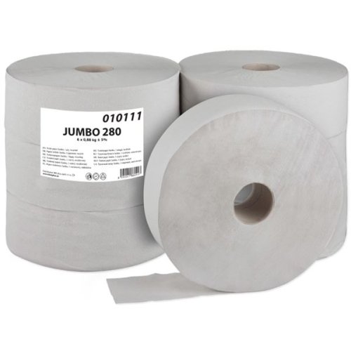 Toaletný papier jumbo 1vrstvový Farba šedá Materiál: recyklácia Priemer dutinky 6 cm Priemer rolky 26 cm Návin 265 m V balení 6 roliek