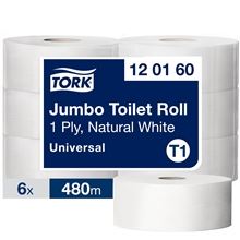 Jednovrstvový toaletný papier Tork Jumbo v roli v kvalite Universal spĺňa základné potreby toaliet a umyvární a súčasne ponúka dobrú kvalitu za primeranú cenu