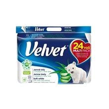 Toaletný papier Velvet - 3vrstvový, jemne biely 100% celulóza Návin 16,95 m Rozmer útržku 9,3x11,3 cm Priemer dutinky 4,4 cm Priemer role 9,8 cm Počet útržkov 150 Počet rolí 24 Certifikát PEFC