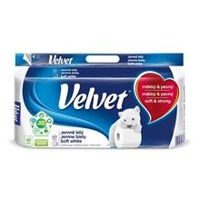 Toaletný papier Velvet - 3vrstvový, jemne biely 100% celulóza Návin 18,3 m Veľkosť útržku 9,3x12,2 cm Priemer dutinky 4,4 cm Priemer role 11,5 cm 150 útržkov Počet rolí 8 Certifikát PEFC