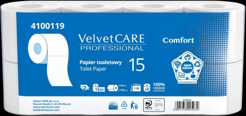 Toaletný papier Velvet Professional - 2 vrstvový, 15 m, 8 roliek 100% celulóza 2vrstvový Návin 15 m Rozmer útržku 9,2 x 11 cm 138 útržkov Priemer dutinky 4,5 cm Balenie 8 roliek