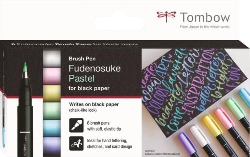 Populárne fixy Fudenosuke teraz tiež vo verzii vhodnej na písanie na čiernom a iných tmavých papieroch. Mäkká verzia hrotu poskytuje pri písaní pocit mimoriadnej ľahkosti a perfektne sa hodí pre ručne písané nápisy, skicovanie alebo výrobu prianí. 5 štýlových pastelových farieb plus biela farba s úžasným kriedovým efektom. „Kúzelný“ pigmentový atrament na báze vody: farba sa objaví až pár sekúnd po jej nanesení na tmavý papí r. Vrstvením atramentu je možné vytvoriť intenzívnejšie farby. Skvele sa hodí na kombinovanie rôznych pomôcok, techník a materiálov, teda mixed média. Krásne sa dopĺňa s pastelkami IROJITEN, fixkami ABT PRO a ostatnými fixkami Fudenosuke. Fixy je možné používať aj na písanie na bielom papieri (výsledok vyzerá inak ako na tmavom papieri). Skladujte vo vodorovnej polohe. Súprava obsahuje 6 fixov Fudenosuke (typu soft) v pastelových odtieňoch: WS-BS01, -BS02, -BS21, -BS58, -BS73, -BS86