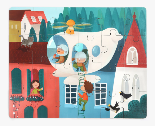 Drevené puzzle ukryté v roztomilej plastovej hračke.