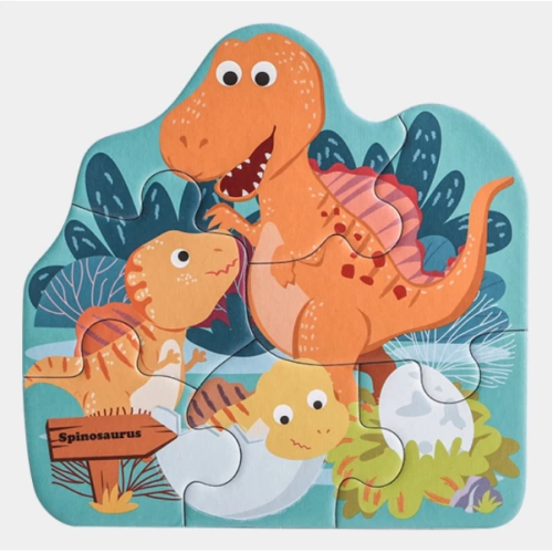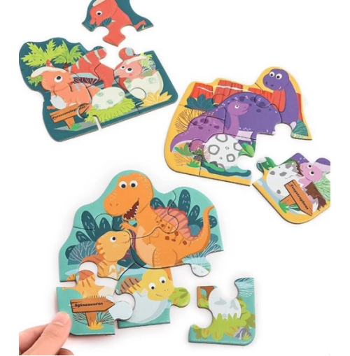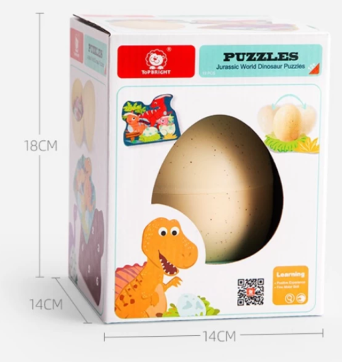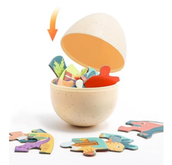 Sada 3 puzzle s dinosaurami po 6 dielikoch, pre jednoduchšie triedenie a skladanie majú dieliky jednotlivých obrázkov zo zadnej strany rovnakú potlač a sú očíslované, vajcia je vyrobené z plastu, ľahko sa otvára a slúži na ukladanie puzzle alebo iných pokladov.