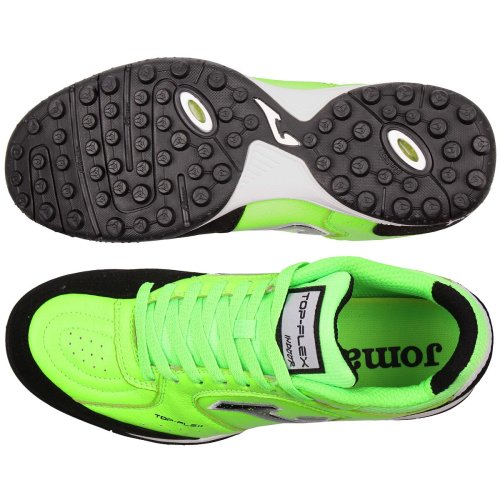 Turfy JOMA Top Flex 2411 sú kopačky s výraznou vzorkou na podrážke, ktorá tak lepšie priľne k povrchu a pomáha futbalistovi udržiavať optimálnu stabilitu. Tento model na umelé povrchy je navrhnutý pre pravidelných hráčov, ktorí hľadajú vysoký výkon a stabilitu zároveň. Zvršok je vyrobený z veľmi pružnej prémiovej kože, vysoko kvalitného nylonového vnútra as perforáciou VTS, ktorá umožňuje cirkuláciu vzduchu a zaisťuje tak správnu ventiláciu. Má zosilnenú špičku pre úder. Spevnená špička ponúka dobrý kontakt s loptou. Phylonová medzipodrážka poskytuje väčšiu stabilitu a odpruženie. Podošva je vyrobená z vysoko kvalitnej gumy s odolnosťou proti oderu DIN-70.