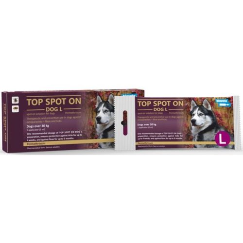Zloženie: Permethrinum 1950 mg. Charakteristika: Liečebné a preventívne použitie u psov proti ektoparazitom – blchám a kliešťom. Použitie: Cieľový druh zvierat: Psy (nad 30 kg). Kontraindikácie: Nepoužívať u mačiek, prípravok je pre nich toxický. Nepoužívať u šteniat mladších ako 3 týždne. Nepoužívať v prípade precitlivenosti na účinnú látku alebo na niektorú z pomocných látok. Použitie počas gravidity, laktácie: Prípravok nemá vplyv na graviditu a laktáciu. Liekové a iné interakcie: Nepoužívajte liek v kombinácii s inými insekticídnymi ektoparazitikami. Nežiaduce účinky: V mieste aplikácie môže dôjsť k prechodnému podráždeniu kože. V týchto prípadoch opláchnite zviera vodou a chráňte ich pred prechladnutím. V prípade pretrvávajúcich nežiaducich účinkov vyhľadajte pomoc veterinárneho lekára. Upozornenie: Tento prípravok je extrémne jedovatý pre mačky a jeho podanie mačkám môže viesť až k ich úhynu z dôvodu špecifickej fyziológie mačiek, ktoré nie sú schopné metabolizovať určité látky vrátane permetrínu. Aby sa zamedzilo náhodnému kontaktu mačiek s prípravkom, udržujte ošetrené psy po ošetrení oddelene od mačiek, pokiaľ nie je miesto aplikácie suché. Je potrebné zabezpečiť česanie psov, u ktorých bol v posledných 48 hodinách aplikovaný tento prípravok, a mačiek odlišnou kefou, z dôvodu možnej toxicity takto prenesenej látky pre mačky. Pri náhodnom použití tej istej kefy vyhľadajte v prípade zmien správania mačky veterinárneho lekára. Presne dodržujte vhodnú veľkosť balenia. Pre malé psy, psy malých plemien, je kontraindikované podanie prípravku Top spot on Dog M alebo Top spot on Dog L. Pre stredne veľké psy, psy stredných plemien, je kontraindikované podanie prípravku Top spot on Dog L . Po aplikácii sa odporúča po dobu 12-24 hod. obmedziť manipuláciu so zvieratami. Neodporúča sa ich pohyb na slnku. Po ošetrení sa neodporúča po dobu 12 hodín kúpania zvierat. Šampónovaním môže byť negatívne ovplyvnená dĺžka ochranného účinku. Rezistencia parazitov voči ktorejkoľvek skupine ektoparazitík sa môže vyvinúť po častom, opakovanom použití ektoparazitika z rovnakej skupiny, s rovnakým spôsobom účinku. Dávkovanie a spôsob podávania: Len na podanie nakvapkaním na kožu – spot-on. Psy nad 30 kg – obsah aplikátora (3 ml) sa nanesie na kožu v oblasti medzi lopatkami, stredu chrbta a pri koreni chvosta u psov veľkých plemien. Aplikátor držte hrdlom hore a niekoľkokrát poklepte na hrdlo prstom. Opatrne odlomte špičku krútivým pohybom. Rozhrňte srsť zvieraťa v kohútiku pred lopatkami tak, aby bola viditeľná koža. Hrot nástavca priložte na kožu a niekoľkokrát stlačte aplikátor tak, aby sa celý obsah aplikátora vyprázdnil priamo na koži. Nevtierať. Pokiaľ psy po ošetrení premoknú alebo sú šampónovaní, je nutné ošetrenie opakovať. Interval medzi jednotlivými ošetreniami by mal byť najmenej 7 dní. Predávkovanie: Pri predávkovaní môže dôjsť k lokálnemu podráždeniu kože, zmene citlivosti až znecitliveniu, svrbeniu, brneniu a páleniu. Ak dôjde ku vstreknutiu účinnej látky do oka, môže vyvolať slzenie a prechodnú konjunktivitídu. Na dýchací trakt pôsobí prípravok dráždivo. Môže sa objaviť kašeľ, kýchanie a výtok z nosa. Po požití účinnej látky dochádza k bolestiam v krku, ktoré sú sprevádzané nauzeou, zvracaním a abdominálnou bolesťou. V ústnej dutine môžu byť prítomné ulcerácie a sekrécia slín je zvýšená. Systémové príznaky sa objavia za 4–48 hodín po expozícii (závraty, bolesti hlavy a únava, palpitácia srdca, bolesť na hrudi, zastretý zrak). Kóma a kŕče sú život ohrozujúce. V prípade náhodného zásahu oka opatrne vypláchnite oko čistou vodou. Pokiaľ prípravok pôsobí dráždivo v mieste aplikácie, opláchnite zviera čistou vodou. Ak sa objavia systémové príznaky, vyhľadajte veterinárneho lekára. Špeciálne opatrenia pri používaní: Špeciálne opatrenia pri používaní u zvierat Prípravok aplikovať iba na povrch kože. Neaplikovať perorálne alebo parenterálne. Vyhnúť sa podaniu lieku na sliznice (do očí, nozdier, na sliznice genitálií a do miest poranenia kože). Je dôležité zaistiť aplikáciu prípravku na určené miesto a po aplikácii zabrániť olizovaniu miesta podania i vzájomnému olizovaniu zvierat. V ojedinelých prípadoch u zvlášť citlivých jedincov môže dôjsť k prechodnému podráždeniu kože v mieste aplikácie. V týchto prípadoch opláchnite zviera vodou. Vzhľadom na možnosť zamorenia miesta pobytu zvierat blchami, je nutné toto prostredie pravidelne asanovať vhodným insekticídom. Osobitné opatrenia určené osobám, ktoré podávajú veterinárny liek zvieratám Počas aplikácie lieku nejedzte, nepite ani nefajčite. Na dýchací trakt pôsobí prípravok dráždivo. Zabráňte kontaktu prípravku s kožou a očami. V prípade náhodného postriekania kože okamžite umyte zasiahnuté miesto vodou a mydlom. V prípade náhodného kontaktu prípravku s očami ich dôkladne vypláchnite vodou. Pokiaľ podráždenie kože alebo očí pretrváva, alebo ak je veterinárny liek náhodne požitiu, vyhľadajte ihneď lekársku pomoc a ukážte písomnú informáciu alebo etiketu praktickému lekárovi. Ľudia so známou precitlivenosťou na permethrin by sa mali vyhnúť kontaktu s veterinárnym liekom. Po použití si umyte ruky. Nemanipulujte s ošetrenými zvieratami a zabráňte deťom hrať sa s nimi, kým nezaschne miesto aplikácie a to najmenej 24 hodín po aplikácii. Odporúča sa preto neošetrovať zvieratá počas dňa, ale v podvečer, a nedovoliť čerstvo ošetreným zvieratám spať s ich majiteľmi, najmä deťmi. Ďalšie opatrenia Liek môže mať nežiaduce účinky na vodné živočíchy. Ošetreným psom
