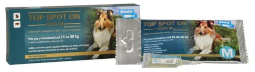 Zloženie: Permethrinum 1300 mg. Charakteristika: Liečebné a preventívne použitie u psov proti ektoparazitom – blchám a kliešťom. Použitie: Cieľový druh zvierat: Psy (15-30 kg). Kontraindikácie: Nepoužívať u mačiek, prípravok je pre nich toxický. Nepoužívať u šteniat mladších ako 3 týždne. Nepoužívať v prípade precitlivenosti na účinnú látku alebo na niektorú z pomocných látok. Použitie počas gravidity, laktácie: Prípravok nemá vplyv na graviditu a laktáciu. Liekové a iné interakcie: Nepoužívajte liek v kombinácii s inými insekticídnymi ektoparazitikami. Nežiaduce účinky: V mieste aplikácie môže dôjsť k prechodnému podráždeniu kože. V týchto prípadoch opláchnite zviera vodou a chráňte ich pred prechladnutím. V prípade pretrvávajúcich nežiaducich účinkov vyhľadajte pomoc veterinárneho lekára. Upozornenie: Tento prípravok je extrémne jedovatý pre mačky a jeho podanie mačkám môže viesť až k ich úhynu z dôvodu špecifickej fyziológie mačiek, ktoré nie sú schopné metabolizovať určité látky vrátane permetrínu. Aby sa zamedzilo náhodnému kontaktu mačiek s prípravkom, udržujte ošetrené psy po ošetrení oddelene od mačiek, pokiaľ nie je miesto aplikácie suché. Je potrebné zabezpečiť česanie psov, u ktorých bol v posledných 48 hodinách aplikovaný tento prípravok, a mačiek odlišnou kefou, z dôvodu možnej toxicity takto prenesenej látky pre mačky. Pri náhodnom použití tej istej kefy vyhľadajte v prípade zmien správania mačky veterinárneho lekára. Presne dodržujte vhodnú veľkosť balenia. Pre malé psy, psy malých plemien, je kontraindikované podanie prípravku Top spot on Dog M alebo Top spot on Dog L. Pre stredne veľké psy, psy stredných plemien, je kontraindikované podanie prípravku Top spot on Dog L. Po aplikácii sa odporúča po dobu 12 -24 hod. obmedziť manipuláciu so zvieratami. Neodporúča sa ich pohyb na slnku. Po ošetrení sa neodporúča po dobu 12 hodín kúpania zvierat. Šampónovaním môže byť negatívne ovplyvnená dĺžka ochranného účinku. Rezistencia parazitov voči ktorejkoľvek skupine ektoparazitík sa môže vyvinúť po častom, opakovanom použití ektoparazitika z rovnakej skupiny, s rovnakým spôsobom účinku. Dávkovanie a spôsob podávania: Len na podanie nakvapkaním na kožu – spot-on. Psy nad 30 kg – obsah aplikátora (3 ml) sa nanesie na kožu v oblasti medzi lopatkami, stredu chrbta a pri koreni chvosta u psov veľkých plemien. Aplikátor držte hrdlom hore a niekoľkokrát poklepte na hrdlo prstom. Opatrne odlomte špičku krútivým pohybom. Rozhrňte srsť zvieraťa v kohútiku pred lopatkami tak, aby bola viditeľná koža. Hrot nástavca priložte na kožu a niekoľkokrát stlačte aplikátor tak, aby sa celý obsah aplikátora vyprázdnil priamo na koži. Nevtierať. Pokiaľ psy po ošetrení premoknú alebo sú šampónovaní, je nutné ošetrenie opakovať. Interval medzi jednotlivými ošetreniami by mal byť najmenej 7 dní. Predávkovanie: Pri predávkovaní môže dôjsť k lokálnemu podráždeniu kože, zmene citlivosti až znecitliveniu, svrbeniu, brneniu a páleniu. Ak dôjde ku vstreknutiu účinnej látky do oka, môže vyvolať slzenie a prechodnú konjunktivitídu. Na dýchací trakt pôsobí prípravok dráždivo. Môže sa objaviť kašeľ, kýchanie a výtok z nosa. Po požití účinnej látky dochádza k bolestiam v krku, ktoré sú sprevádzané nauzeou, zvracaním a abdominálnou bolesťou. V ústnej dutine môžu byť prítomné ulcerácie a sekrécia slín je zvýšená. Systémové príznaky sa objavia za 4–48 hodín po expozícii (závraty, bolesti hlavy a únava, palpitácia srdca, bolesť na hrudi, zastretý zrak). Kóma a kŕče sú život ohrozujúce. V prípade náhodného zásahu oka opatrne vypláchnite oko čistou vodou. Pokiaľ prípravok pôsobí dráždivo v mieste aplikácie, opláchnite zviera čistou vodou. Ak sa objavia systémové príznaky, vyhľadajte veterinárneho lekára. Špeciálne opatrenia pri používaní: Špeciálne opatrenia pri používaní u zvierat Prípravok aplikovať iba na povrch kože. Neaplikovať perorálne alebo parenterálne. Vyhnúť sa podaniu lieku na sliznice (do očí, nozdier, na sliznice genitálií a do miest poranenia kože). Je dôležité zaistiť aplikáciu prípravku na určené miesto a po aplikácii zabrániť olizovaniu miesta podania i vzájomnému olizovaniu zvierat. V ojedinelých prípadoch u zvlášť citlivých jedincov môže dôjsť k prechodnému podráždeniu kože v mieste aplikácie. V týchto prípadoch opláchnite zviera vodou. Vzhľadom na možnosť zamorenia miesta pobytu zvierat blchami, je nutné toto prostredie pravidelne asanovať vhodným insekticídom. Osobitné opatrenia určené osobám, ktoré podávajú veterinárny liek zvieratám Počas aplikácie lieku nejedzte, nepite ani nefajčite. Na dýchací trakt pôsobí prípravok dráždivo. Zabráňte kontaktu prípravku s kožou a očami. V prípade náhodného postriekania kože okamžite umyte zasiahnuté miesto vodou a mydlom. V prípade náhodného kontaktu prípravku s očami ich dôkladne vypláchnite vodou. Pokiaľ podráždenie kože alebo očí pretrváva, alebo ak je veterinárny liek náhodne požitiu, vyhľadajte ihneď lekársku pomoc a ukážte písomnú informáciu alebo etiketu praktickému lekárovi. Ľudia so známou precitlivenosťou na permethrin by sa mali vyhnúť kontaktu s veterinárnym liekom. Po použití si umyte ruky. Nemanipulujte s ošetrenými zvieratami a zabráňte deťom hrať sa s nimi, kým nezaschne miesto aplikácie a to najmenej 24 hodín po aplikácii. Odporúča sa preto neošetrovať zvieratá počas dňa, ale v podvečer, a nedovoliť čerstvo ošetreným zvieratám spať s ich majiteľmi, najmä deťmi. Ďalšie opatrenia Liek môže mať nežiaduce účinky na vodné živočíchy. Ošetreným psom 
