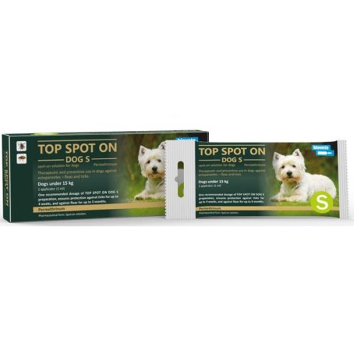 Zloženie: Permethrinum 650 mg. Charakteristika: Liečebné a preventívne použitie u psov proti ektoparazitom – blchám a kliešťom. Použitie: Cieľový druh zvierat: Psy (do 15 kg). Kontraindikácie: Nepoužívať u mačiek, prípravok je pre nich toxický. Nepoužívať u šteniat mladších ako 3 týždne. Nepoužívať v prípade precitlivenosti na účinnú látku alebo na niektorú z pomocných látok. Použitie počas gravidity, laktácie: Prípravok nemá vplyv na graviditu a laktáciu. Liekové a iné interakcie: Nepoužívajte liek v kombinácii s inými insekticídnymi ektoparazitikami. Nežiaduce účinky: V mieste aplikácie môže dôjsť k prechodnému podráždeniu kože. V týchto prípadoch opláchnite zviera vodou a chráňte ich pred prechladnutím. V prípade pretrvávajúcich nežiaducich účinkov vyhľadajte pomoc veterinárneho lekára. Upozornenie: Tento prípravok je extrémne jedovatý pre mačky a jeho podanie mačkám môže viesť až k ich úhynu z dôvodu špecifickej fyziológie mačiek, ktoré nie sú schopné metabolizovať určité látky vrátane permetrínu. Aby sa zamedzilo náhodnému kontaktu mačiek s prípravkom, udržujte ošetrené psy po ošetrení oddelene od mačiek, pokiaľ nie je miesto aplikácie suché. Je potrebné zabezpečiť česanie psov, u ktorých bol v posledných 48 hodinách aplikovaný tento prípravok, a mačiek odlišnou kefou, z dôvodu možnej toxicity takto prenesenej látky pre mačky. Pri náhodnom použití tej istej kefy vyhľadajte v prípade zmien správania mačky veterinárneho lekára. Presne dodržujte vhodnú veľkosť balenia. Pre malé psy, psy malých plemien, je kontraindikované podanie prípravku Top spot on Dog M alebo Top spot on Dog L. Pre stredne veľké psy, psy stredných plemien, je kontraindikované podanie prípravku Top spot on Dog L . Po aplikácii sa odporúča po dobu 12 – 24 hod. obmedziť manipuláciu so zvieratami. Neodporúča sa ich pohyb na slnku. Po ošetrení sa neodporúča po dobu 12 hodín kúpania zvierat. Šampónovaním môže byť negatívne ovplyvnená dĺžka ochranného účinku. Rezistencia parazitov voči ktorejkoľvek skupine ektoparazitík sa môže vyvinúť po častom, opakovanom použití ektoparazitika z rovnakej skupiny, s rovnakým spôsobom účinku. Dávkovanie a spôsob podávania: Len na podanie nakvapkaním na kožu – spot-on. Psy nad 30 kg – obsah aplikátora (3 ml) sa nanesie na kožu v oblasti medzi lopatkami, stredu chrbta a pri koreni chvosta u psov veľkých plemien. Aplikátor držte hrdlom hore a niekoľkokrát poklepte na hrdlo prstom. Opatrne odlomte špičku krútivým pohybom. Rozhrňte srsť zvieraťa v kohútiku pred lopatkami tak, aby bola viditeľná koža. Hrot nástavca priložte na kožu a niekoľkokrát stlačte aplikátor tak, aby sa celý obsah aplikátora vyprázdnil priamo na koži. Nevtierať. Pokiaľ psy po ošetrení premoknú alebo sú šampónovaní, je nutné ošetrenie opakovať. Interval medzi jednotlivými ošetreniami by mal byť najmenej 7 dní. Predávkovanie: Pri predávkovaní môže dôjsť k lokálnemu podráždeniu kože, zmene citlivosti až znecitliveniu, svrbeniu, brneniu a páleniu. Ak dôjde ku vstreknutiu účinnej látky do oka, môže vyvolať slzenie a prechodnú konjunktivitídu. Na dýchací trakt pôsobí prípravok dráždivo. Môže sa objaviť kašeľ, kýchanie a výtok z nosa. Po požití účinnej látky dochádza k bolestiam v krku, ktoré sú sprevádzané nauzeou, zvracaním a abdominálnou bolesťou. V ústnej dutine môžu byť prítomné ulcerácie a sekrécia slín je zvýšená. Systémové príznaky sa objavia za 4–48 hodín po expozícii (závraty, bolesti hlavy a únava, palpitácia srdca, bolesť na hrudi, zastretý zrak). Kóma a kŕče sú život ohrozujúce. V prípade náhodného zásahu oka opatrne vypláchnite oko čistou vodou. Pokiaľ prípravok pôsobí dráždivo v mieste aplikácie, opláchnite zviera čistou vodou. Ak sa objavia systémové príznaky, vyhľadajte veterinárneho lekára. Špeciálne opatrenia pri používaní: Špeciálne opatrenia pri používaní u zvierat Prípravok aplikovať iba na povrch kože. Neaplikovať perorálne alebo parenterálne. Vyhnúť sa podaniu lieku na sliznice (do očí, nozdier, na sliznice genitálií a do miest poranenia kože). Je dôležité zaistiť aplikáciu prípravku na určené miesto a po aplikácii zabrániť olizovaniu miesta podania i vzájomnému olizovaniu zvierat. V ojedinelých prípadoch u zvlášť citlivých jedincov môže dôjsť k prechodnému podráždeniu kože v mieste aplikácie. V týchto prípadoch opláchnite zviera vodou. Vzhľadom na možnosť zamorenia miesta pobytu zvierat blchami, je nutné toto prostredie pravidelne asanovať vhodným insekticídom. Osobitné opatrenia určené osobám, ktoré podávajú veterinárny liek zvieratám Počas aplikácie lieku nejedzte, nepite ani nefajčite. Na dýchací trakt pôsobí prípravok dráždivo. Zabráňte kontaktu prípravku s kožou a očami. V prípade náhodného postriekania kože okamžite umyte zasiahnuté miesto vodou a mydlom. V prípade náhodného kontaktu prípravku s očami ich dôkladne vypláchnite vodou. Pokiaľ podráždenie kože alebo očí pretrváva, alebo ak je veterinárny liek náhodne požitiu, vyhľadajte ihneď lekársku pomoc a ukážte písomnú informáciu alebo etiketu praktickému lekárovi. Ľudia so známou precitlivenosťou na permethrin by sa mali vyhnúť kontaktu s veterinárnym liekom. Po použití si umyte ruky. Nemanipulujte s ošetrenými zvieratami a zabráňte deťom hrať sa s nimi, kým nezaschne miesto aplikácie a to najmenej 24 hodín po aplikácii. Odporúča sa preto neošetrovať zvieratá počas dňa, ale v podvečer, a nedovoliť čerstvo ošetreným zvieratám spať s ich majiteľmi, najmä deťmi. Ďalšie opatrenia Liek môže mať nežiaduce účinky na vodné živočíchy. Ošetreným ps