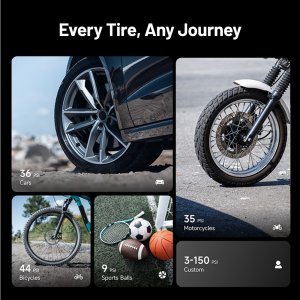 Integrovaný kompresor Maximálny tlak 150 PSI nafúkne pneumatiky auta, motorky aj bicykla a nechýbajú ani adaptéry pre športové vybavenie či nafukovacie doplnky. Na prehľadnom LCD displeji ľahko nastavíte požadovaný tlak a kompresor sa sám zastaví po dosiahnutí zadanej hodnoty.