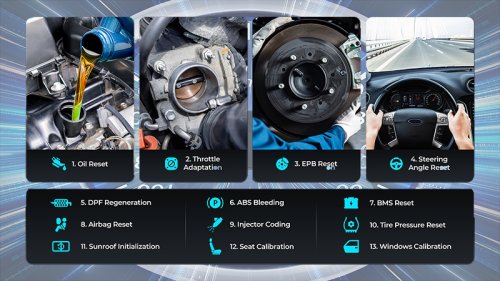Bezproblémové obnovenie prevádzky vášho vozidla Všimli ste si kontrolky údržby? Nebojte sa - naša funkcia resetovania oleja vám kryje chrbát! TopScan Pre hrdo predstavuje komplexnú sadu 13 funkcií resetovania: Reset oleja, prispôsobenie plynu, reset EPB, reset uhla riadenia a ďalšie. . Diagnostikujte svoje vozidlo, vyriešte výstražné kontrolky.