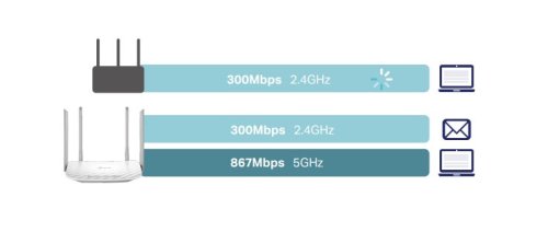 Router Archer C50 pracuje v dvoch pásmach 2,4 GHz a 5 GHz a zaisťuje tak skvelý zážitok pri používaní bezdrôtovej siete. Súbežné využitie oboch pásiem vám ponúka možnosť flexibilne používať dve samostatné siete - ktorých šírky pásiem sa vzájomne podporia, aby všetko čo potrebujete fungovalo hladko. Nenáročné úlohy, ako je posielanie e-mailov alebo prehliadanie internetu zvládne pásmo 2,4 GHz, zatiaľ čo aplikácie, ktoré potrebujú veľkú šírku pásma, ako hranie online hier alebo streamovanie HD videa, obslúži pásmo 5 GHz – všetko súčasne.