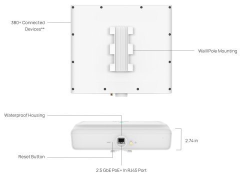 Hardwarové špecifikácie * Rozhranie: 1× 2.5G Ethernet (RJ-45) Port (Support 802.3at PoE) * Tlačidlo: Reset * Napájanie: 802.3at PoE * Max. spotreba energie: 21.5W (for PoE) * Rozmery (Š × H × V): 9.1 × 8.2 × 2.8 in (230 × 207.5 × 69.7 mm) * Antény: Vstavané smerové antény: