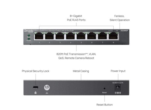 Vlastnosti: *8× 10/100/1000 Mbps PoE+ RJ45 Ports (support 802.3af PoE and 802.3at PoE+) *Jednoduché použitie: Podporuje plug-and-play pre okamžité pripojenie a jednoduchú konfiguráciu ďalších funkcií *Centralizovaná správa cloudu prostredníctvom webu alebo aplikácie Omada QoS a izolácia portov pre spoľahlivé siete kamerových systémov *Automatická prevencia slučiek a IGMP Snooping *Bezventilátorový dizajn pre tichú prevádzku *Odolné kovové puzdro a možnosť umiestnenia na stôl alebo montáže na stenu