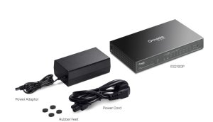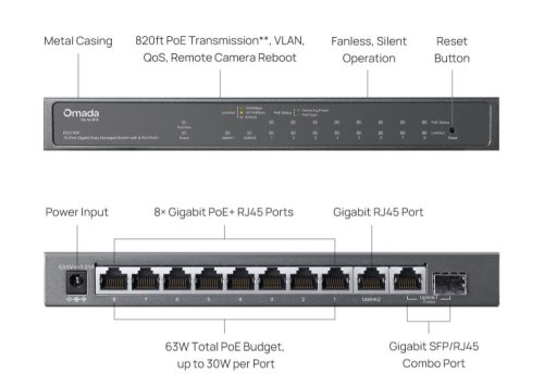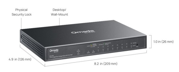 Hardvérové parametre: * Rozhranie: 8× 10/100/1000 Mbps PoE+ RJ45 porty (podpora 802.3af PoE a 802.3at PoE+) 1× 10/100/1000 Mbps RJ45 port 1× Gigabit SFP/ MDI/MDIX * Počet ventilátorov: Bez ventilátorov * Inštalácia: stolný, na stenu * Fyzický bezpečnostný zámok: Áno * Napájanie: Napájací adaptér jednosmerného prúdu (výstup: 53,5 V DC / 1,31 A) * Rozmery (Š × H × V): 8,2 × 4,6 × 2, 9 proti prepätiu: ±6 kV