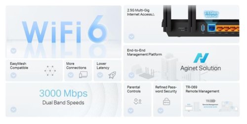 *Zvýšené pokrytie: Štyri vysoko výkonné antény a technológie Beamforming spoločne rozširujú silné a spoľahlivé WiFi v celom vašom dome. *Viac pripojenia: Technológie OFDMA a MU-MIMO zvyšujú kapacitu a umožňujú súčasný prenos do viacerých zariadení. *EasyMesh Compatible: Vytvorte múdru sieť mesh s bezproblémovým pokrytím a väčšou flexibilitou založenou na štandardnej technológii mesh. *Vylepšené zabezpečenie: Šifrovanie WPA3, Multi-SSID a rodičovská kontrola poskytujú personalizované a bezpečnejšie online prostredie. *Bleskovo rýchle zdieľanie médií: USB 3.0 vám umožňuje zdieľať vaše mediálne zdroje až 10× rýchlejšie ako USB 2.0. *Jednoduché nastavenie: Nastavte si sieť v priebehu niekoľkých minút pomocou výkonnej aplikácie Aginet. *Vzdialená správa: Podporované sú protokoly TAUC (TP-Link Aginet Unified Cloud založené na TR-369) a TR-069, TR-098, TR-181, TR-111, TR-143.