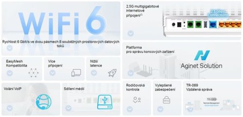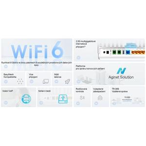 Dvojpásmový Wi-Fi 6 router AX6000 VoIP so závratne rýchlou WiFi až 6Gbps umožňuje rýchlejšie prezeranie webových stránok, streamovanie a sťahovanie - a to všetko súčasne. Router disponuje 2.5G WAN portom, 2.5G LAN portom a 3 gigabotovými LAN portami, dual-band WiFi6 802.11ax s rýchlosťou na 5GHz až 4804 Mb/sa pre 2,4GHz až 1148 Mb/s. Na pripojenie VOIP telefónov sú pripravené 2 samostatné porty. Tento model tiež ponúka možnosť novej technológie EasyMesh, ktorá uľahčí používanie viacerých zariadení zároveň ako jednu veľkú sieť. Vďaka portu USB 3.0 je možné tiež zdieľať rôzne médiá cez sieť alebo pomocou internetu. Ľahkú inštaláciu zaistí aplikácia Aginet, ktorá vás prevedie jednoduchou konfiguráciou.
