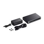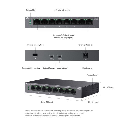Rozpočet PoE 62 W: Osem gigabitových portov s podporou PoE+ štandardov 802.3af/at ľahko pripojí a napája zariadenia, ako sú IP kamery, prístupové body a IP telefóny, cez jediný kábel. Každý PoE port podporuje výkon až 30 W.*
