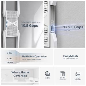 Nová generácia Wi-Fi 7: Využite výkon najnovšieho štandardu Wi-Fi - využite pásmo 6 GHz, 320 MHz kanálov, 4K-QAM, MLO a Multi-RU v 6 prúdoch pre optimalizovanú distribúciu signálu v celej domácnosti.