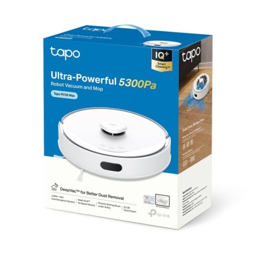 Túžite po dokonale čistej domácnosti? Robotický vysávač TP-Link Tapo RV30 Max White vás zbaví prachu, chlpov, omrviniek a ďalších nečistôt na podlahe aj v kobercoch. Vďaka špičkovému saciemu výkonu 5 300 Pa dôkladne čistí miestnosti vo vašom dome. HEPA filtra a technológie DeepVac navyše zachytí až 97% prachu, čo ocenia nielen alergici, a nedochádza k jeho upchávaniu.