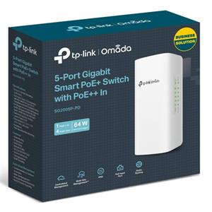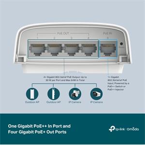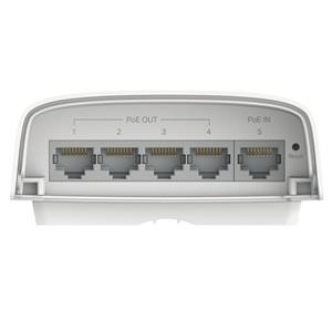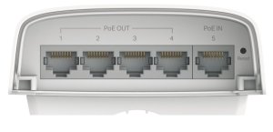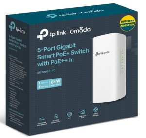 TP-Link SG2005P-PD vonkajší PoE switch s krytím IP55, vybavený 5x 1Gb/s LAN portami, z ktorých 1 port podporuje PoE-IN 802.3bt Type 4 (90 W) a zvyšné 4 porty sú PoE-OUT s podporou 802.3af/ at. Správa switcha je možná cez webový manažment alebo centrálnu cloudovú správu Omada SDN.