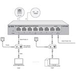 Reverzný spravovateľný gigabitový PoE switch v kompaktnom kovovom tele. Ponúka osem GbE RJ-45 portov , z toho sedem s funkciou PoE-in a jeden s funkciou PoE-out. Reverzný PoE Switch veľmi uľahčuje napájanie pri inštalácii v chodbách a zároveň poskytuje širokopásmový prístup pre bežnú domácnosť alebo napríklad malý podnik, ktorý má v budove už vedené káble.