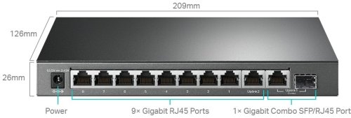 PARAMETRE Rozhranie: 10x 10/100/1000 Mbps RJ45 Portov, 1x 1000 Mbps SFP Slot (Combo) PoE Štandard: 802.3af/at PoE porty: Port 1-8, až 30 W na port PoE Power Budget: 123W Externý napájací adaptér Max. spotreba energie: 7.66 W (bez PD), 141.54 W (s PD) Počet ventilátorov: 0 LED: Power, PoE Max, Rýchlosť, PoE Status Certifikácia: CE, FCC Rozmery: 209 x 126 x 26 mm Operačná teplota: 0 - 40 °C Skladovacia teplota: -40 - 70°C Operačná vlhkosť: 10% až 90% RH Skladovacia vlhkosť: 5% až 98% RH Prepínacia kapacita: 20 Gbps Rýchlosť preposielania: 14.88 Mpps Tabuľka MAC adries: 4K Jumbo Frame: 16 KB