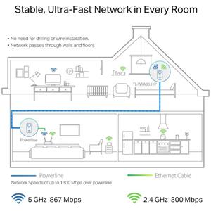 HomePlug AV2 Standard 3 gigabitové porty Konfigurácia Wi-Fi jedným dotykom Plug and Play Dvojpásmová Wi-Fi AC1200 Rýchlosť až 867 Mb/s na 5 GHz a 300 Mb/s na 2,4 GHz