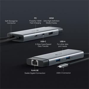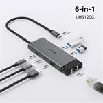 Hub USB-C 6 v 1: UH6120C mení jeden port USB-C na 6 portov s HDMI 4K pri 60 Hz, ethernetom 1 Gb/s, 100W napájanie, 1× dátový port USB-C, 2× dátový port USB-A.