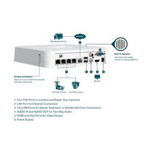 Na záznamovom zariadení nájdete štyri 10/100 Mb/s PoE+ porty. Každý z nich má výkon 30 W. Celkový PoE výkon switchu dosahuje 53 W. Pomocou jediného ethernetového kábla prenáša dáta aj napájanie. Nepotrebujete teda žiadny ďalší napájací adaptér.