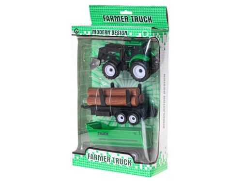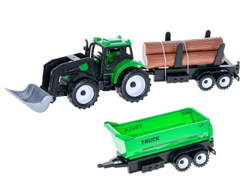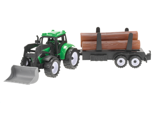 Traktor s vlečkou o veľkosti 38cm má prednú lyžicu na nakladanie a dve vymeniteľné vlečky. Traktor je na setravčník. K dostaniu je v dvoch farebných variantoch.