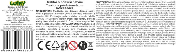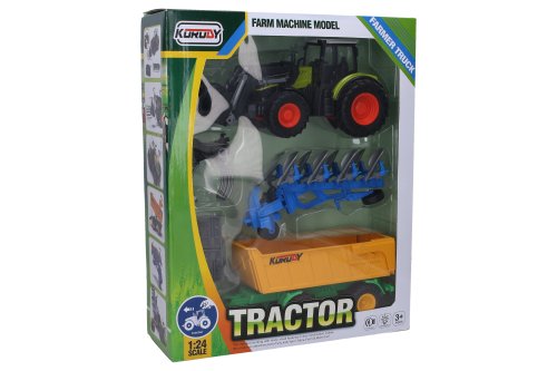Traktor nakladač s efektmi a príslušenstvom. Veľkosť traktora 29 cm. Voľné kolesá. Svetelné a zvukové efekty stlačenia prednej časti traktora. 3xAG13 batérie súčasťou. Súčasťou 3 prípojné zariadenia (1 predné, 2 zadné).