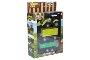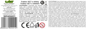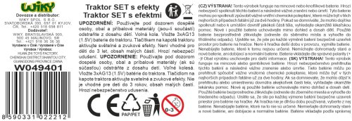 Traktor so zvukovými efektmi set s prívesom. Voľné kolesá. Rozmery traktora 15x6x7 cm. Obsah balenia - traktor, 2x príves 15x6x7 cm. Vydáva svetelné a zvukové efekty. Aktivácia tlačidlom v prednej časti traktora. 3xAG13 (1,5V) batéria, súčasťou balenia.