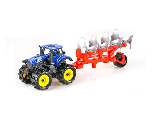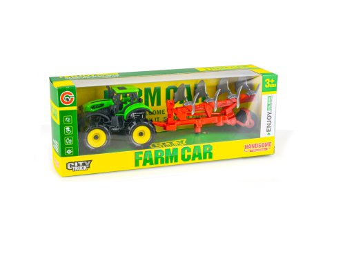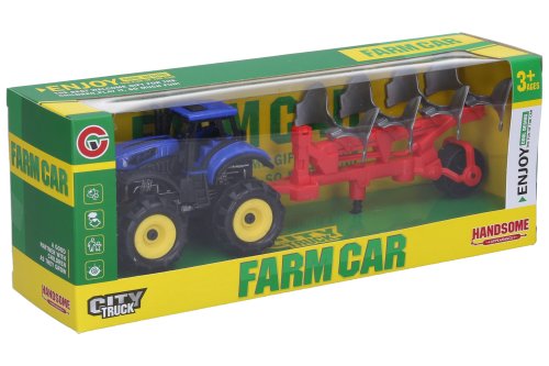 Traktor na zotrvačník s pluhom. Rozmery traktora 25x7x7,5 cm. 2 varianty - modrá, zelená.